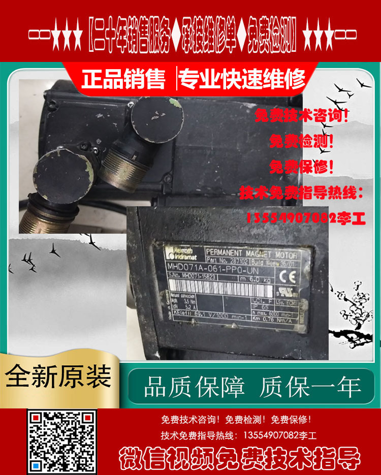 R911279155 MHD071B-061-NP1-UN 力士乐伺服电机维修常见的6种故障 1、编码器故障:编码器是伺服电机的核心部件也是易损部件,可对伺服电机进行编码器的维修和更换,借助美国进口先进检测设备进行可视化零点校对,确保编码器零点位置达到原厂标准,保证伺服电机的原厂电气性能无损。