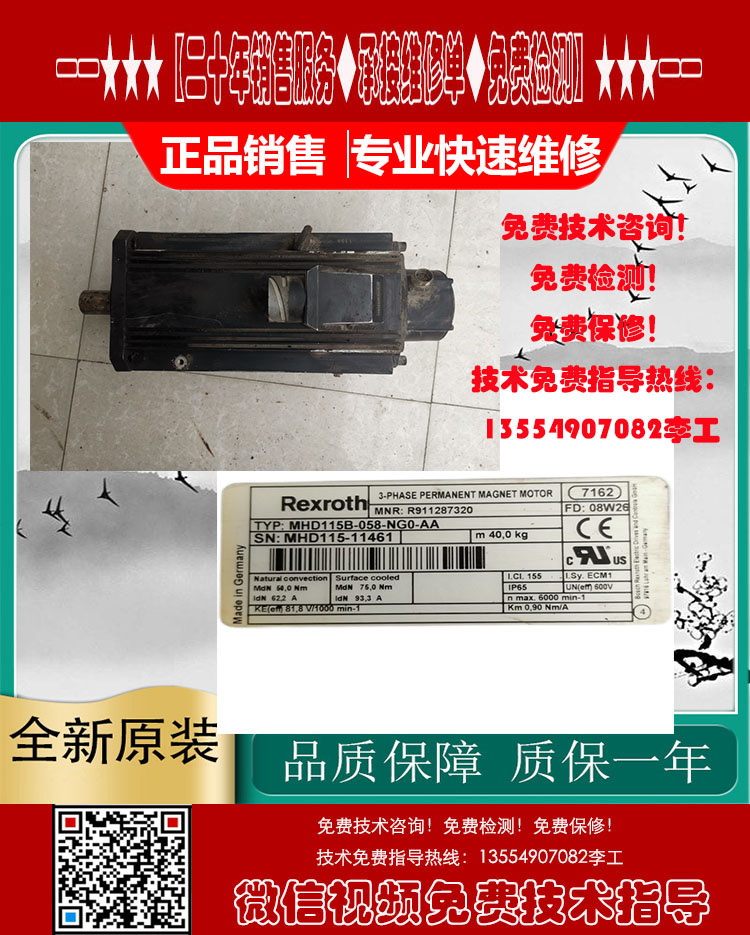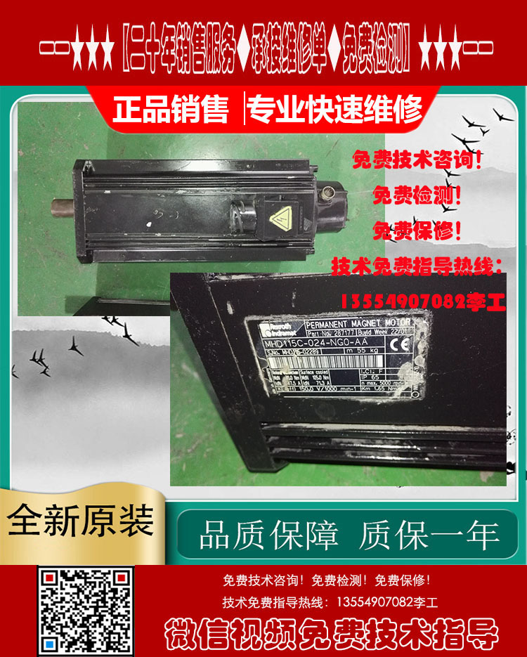 R911287320 MHD115B-058-NG0-AA 力士乐伺服电机维修常见的6种故障 1、编码器故障:编码器是伺服电机的核心部件也是易损部件,可对伺服电机进行编码器的维修和更换,借助美国进口先进检测设备进行可视化零点校对,确保编码器零点位置达到原厂标准,保证伺服电机的原厂电气性能无损。